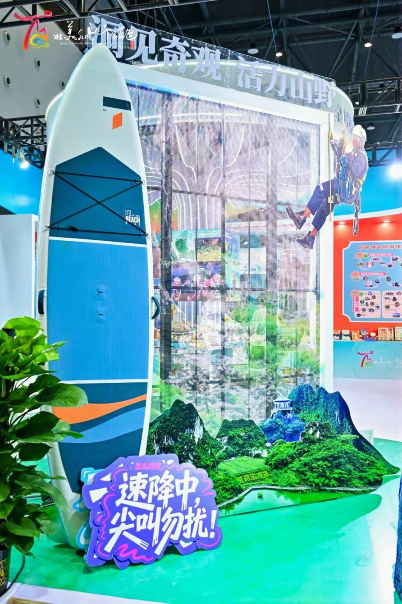“洞见奇观,活力山野”区则以天坑速降造型墙还原乐业县的世界级地质景观,凸显乐业“世界奇观、有机原乡”的资源禀赋。观众打卡拍照可获景区门票奖励。