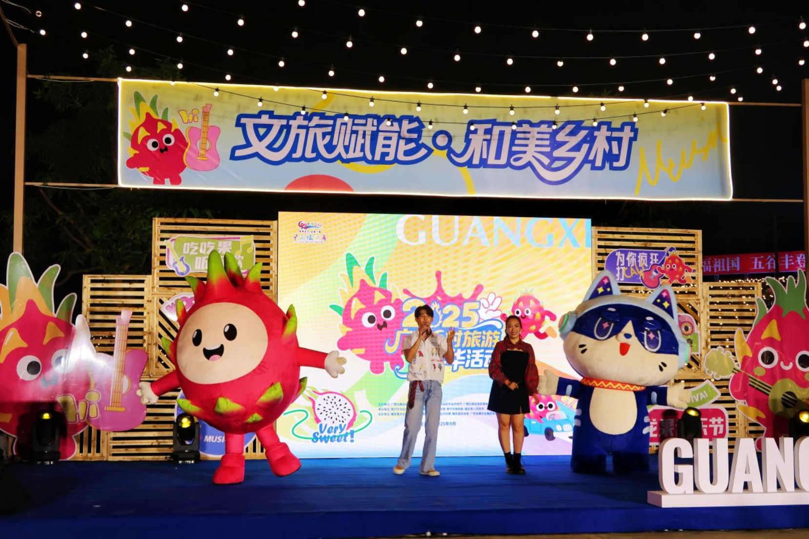 火龙“果王”展采用艺术花雕的形式,向游客展示火龙果、香蕉等特色水果,让单纯的味觉体验瞬间升级为视觉与味觉兼具的感官盛宴;火龙集合站(主题游园会)前排起长龙,游客积极参与投壶、套圈等趣味游园游戏,赢取丰厚的特色奖品,尽情享受乡村旅游带来的欢乐时光;火龙音乐派对热度爆棚,游客在观看精彩音乐节目的同时,通过现场推介深度解锁广西乡村旅游的新玩法。